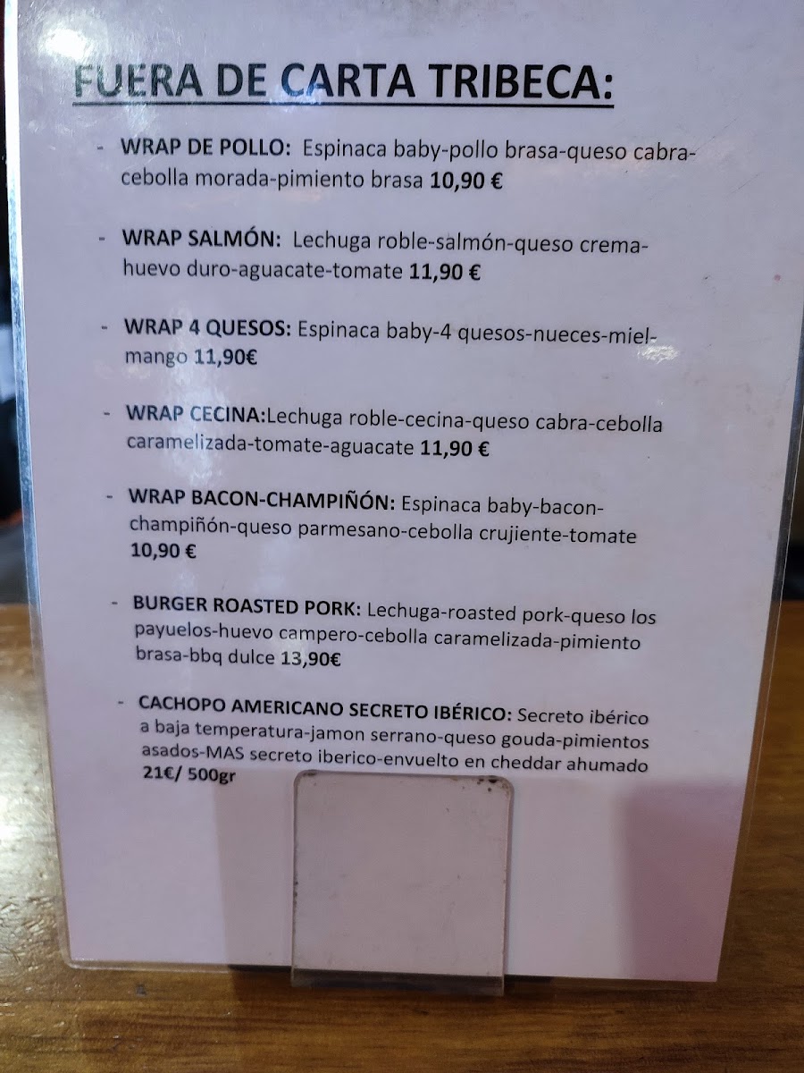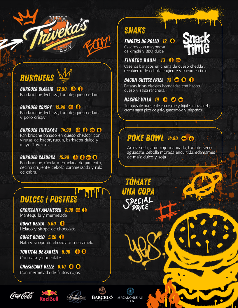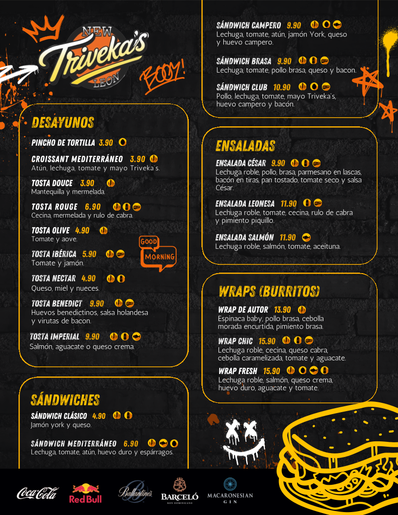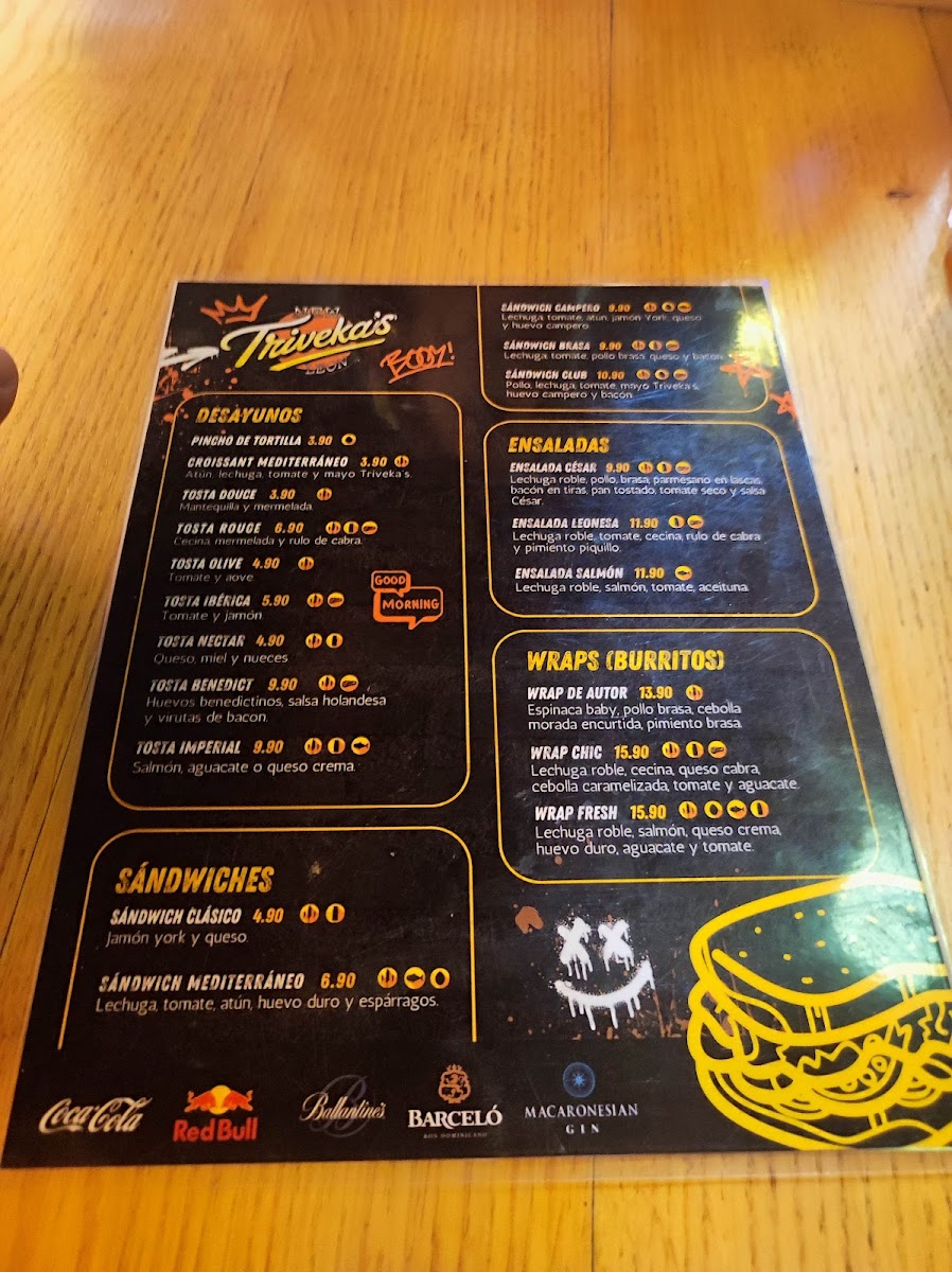 The menu features a range of enticing options, from unique wraps like the savory Wrap de Autor with grilled chicken and roasted peppers, to mouthwatering burgers such as the indulgent Triveka's Burger topped with cheddar and bacon. Each dish is crafted with quality ingredients, offering a delightful twist on fast food.